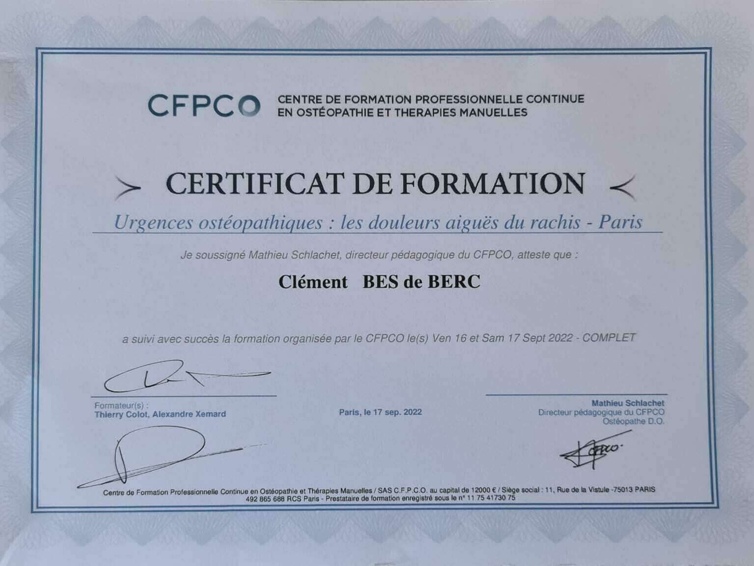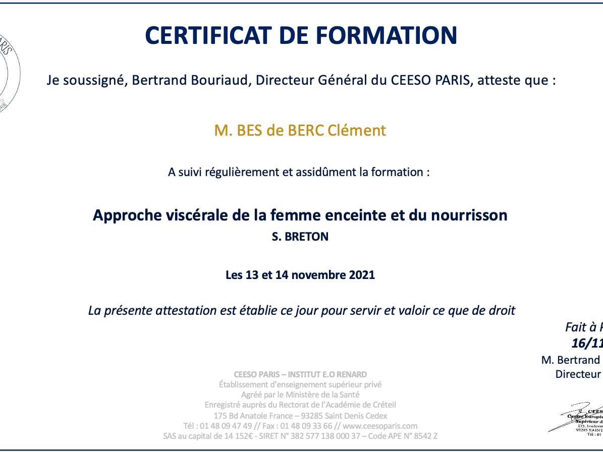 Issu de 5 ans d'étude au CEESO Paris, j'ai suivi une formation basée sur les derniers décrets et les dernières recommandations, ce qui m'a permis de :